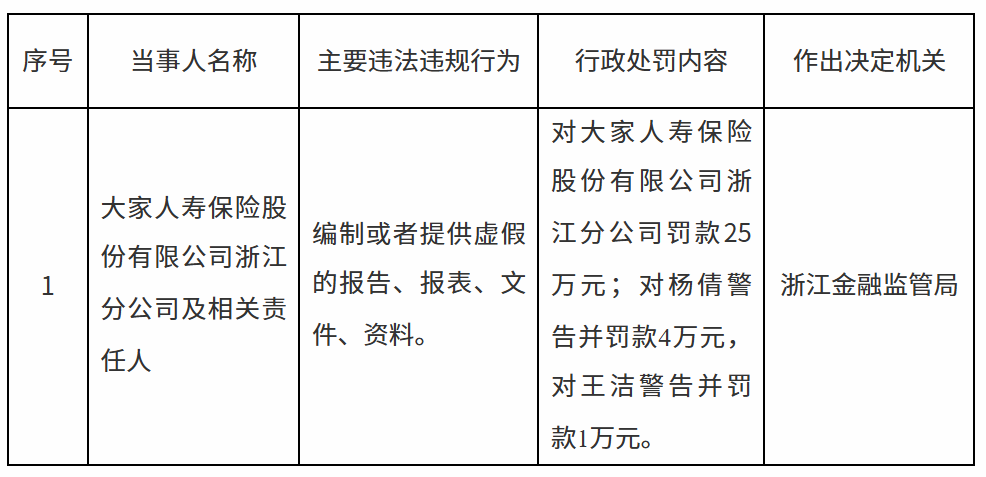 截图:国家金融监督管理总局官网 凤凰网财经讯 10月27日,据国家金融监督管理总局官网消息显示,大家人寿浙江分公司因编制或者提供虚假的报告、报表、文件、资料, 被罚款25万元。 相关责任人杨倩、王洁对上述违规行为负有责任,受到警告,并分别被罚款4万元、1万元。 | 序号 | 当事人名称 | 主要违法违规行为 | 行政处罚内容 | 作出决定机关 | | --- | --- | --- | --- | --- | | 1 | 大家人寿保险股 份有限公司浙江 | | 对大家人寿保险 股份有限公司浙 江分公司罚款25 | 浙江金融监管局 | | | | 编制或者提供虚假 | | | | | 分公司及相关责 | 的报告、报表、文 万元; 对杨倩警 | | | | | 任人 | 件、资料。 | 告并罚款4万元, | | | | | | 对于洁警告并罚 | | | | | | 款1万元。 | | ...