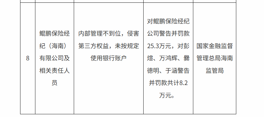 | | | | 对鲲鹏保险经纪 | | | --- | --- | --- | --- | --- | | | 鲲鹏保险经 | 内部管理不到位,侵害 | 公司警告并罚款 | | | | 纪(海南) | 第三方权益,未按规定 | 25.3万元,对彭 | 国家金融监督 | | 8 | 有限公司及 | 使用银行账户 | 煊、万鸿辉、纂 | 管理总局海南 | | | 相关责任人 | | 德明、于涵警告 | 监管局 | | | 员 | | 并罚款共计8.2 | | | | | | 万元。 | | 凤凰网财经讯 1月15日,据国家金融监督管理总局官网消息,鲲鹏保险经纪(海南)因内部管理不到位、侵害第三方权 益、未按规定使用银行账户等违规受到警告并被罚款25.3万元。相关责任人彭煊、万鸿辉、爨德明、于涵分别受到警告并 被罚款共计8.2万元。 ...