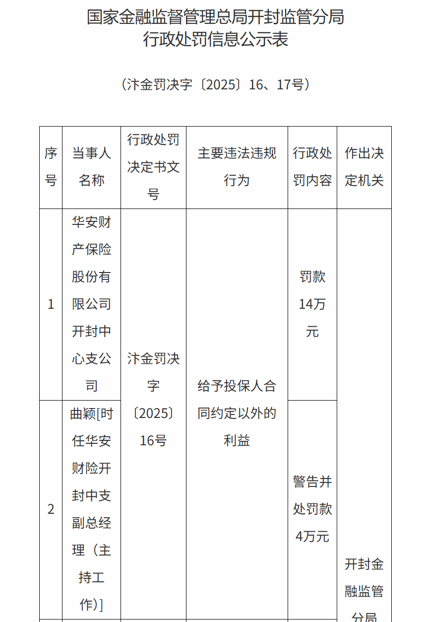 凤凰网财经讯 1月12日,据国家金融监督总局官网消息,华安财险开封中心支公司因给予投保人合同约定以外的利益被罚 款14万元,时任华安财险开封中心支公司副总经理(主持工资)被罚款4万元并受到警告。 | 序 | 当事人 | 行政处罚 | 主要违法违规 | 行政处 | 作出决 | | --- | --- | --- | --- | --- | --- | | 릉 | 名称 | 决定书文 | 行为 | 罚内容 | 定机关 | | | | 름 | | | | | | 华安财 产保险 股份有 限公司 | | | 罚款 14万 | | | 1 | | | | | | | | 开封中 | | | 元 | | | | 心支公 | 汴金罚决 | | | | | | 同 | 字 | 给予投保人合 | | | | | 曲题时 | (2025) | 同约定以外的 | | | | | 任华安 | 16号 | 利益 | | | | | 财险开 封中支 | | | 警告并 | | | 2 | 副总经 | | | 处罚款 | | | | | | | 4万元 | | | | 理 (主 | | | | 开封金 | | | 持工 | | | | | ...