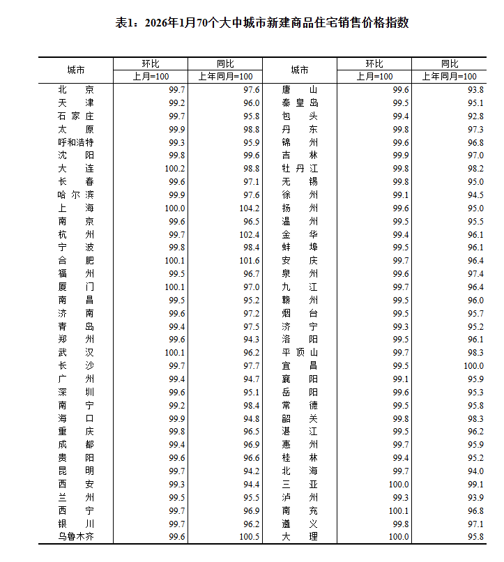 国家统计局城市司首席统计师王中华解读2026年1月份商品住宅销售价格变动情况统计数据