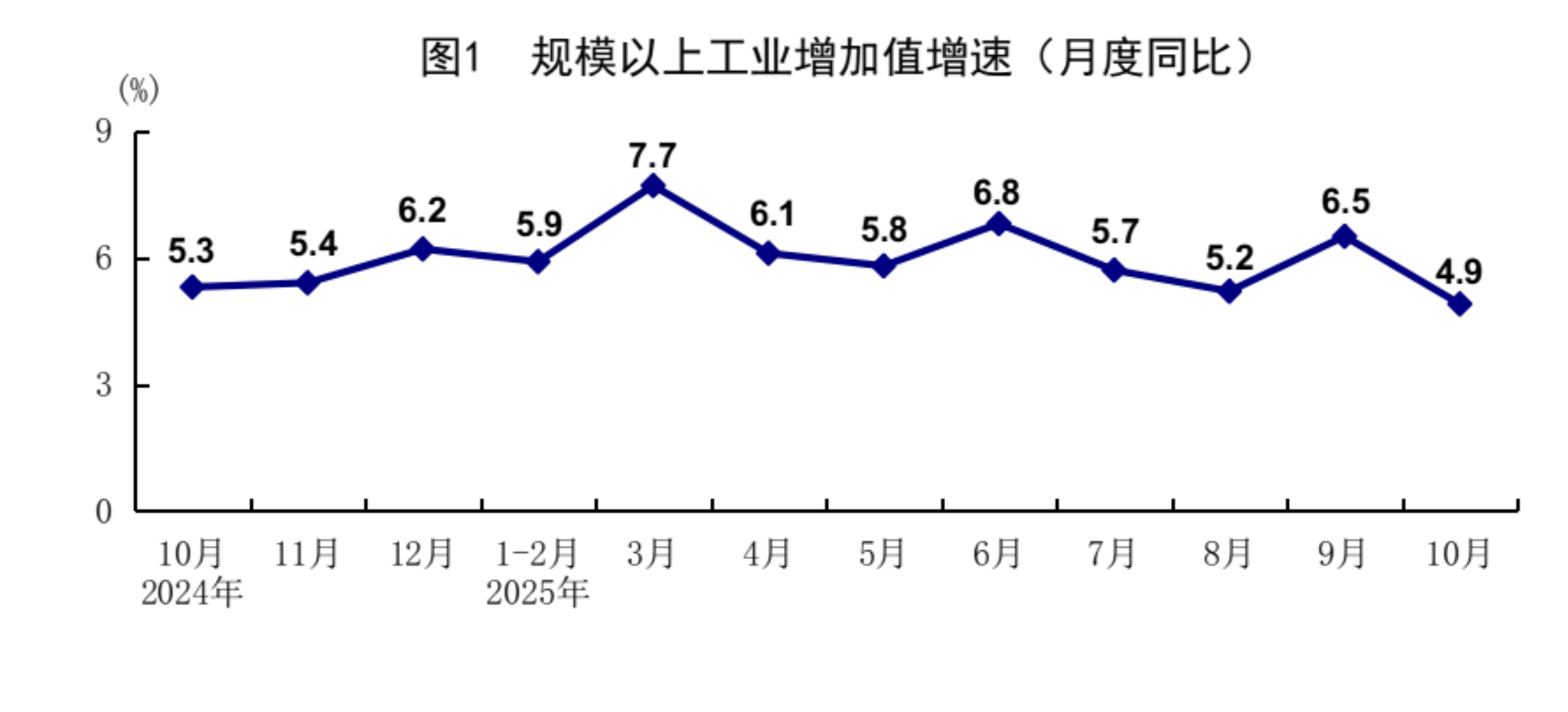 (2025年11月14日) 国家统计局 10月份,在以习近平同志为核心的党中央坚强领导下,各地区各部门认真贯彻落实党中央、国务院决策部署,坚持稳中求进工作总基调,加力稳就业、稳企 业、稳市场、稳预期,纵深推进全国统一大市场建设,积极畅通国内国际双循环,生产供给基本平稳,就业总体稳定,物价有所改善,新动能培育壮大,国 民经济保持总体平稳、稳中有进发展态势。 一、工业生产持续增长,装备制造业和高技术制造业增势较好 10月份,全国规模以上工业增加值同比增长4.9%,环比增长0.17%。分三大门类看,采矿业增加值同比增长4.5%,制造业增长4.9%,电力、热力、燃气及水 生产和供应业增长5.4%。装备制造业增加值同比增长8.0%,高技术制造业增加值增长7.2%,分别快于全部规模以上工业增加值3.1和2.3个百分点。分经济类 型看,国有控股企业增加值同比增长6.7%;股份制企业增长5.2%,外商及港澳台投资企业增长4.0%;私营企业增长2.1%。分产品看,3D打印设备、新能源 汽车、工业机器人产品产量同比分别增长30.8%、19.3%、17.9%。1-10月份,全国规模以上工业增加值同比增长6.1%。10月份,制造业采 ...