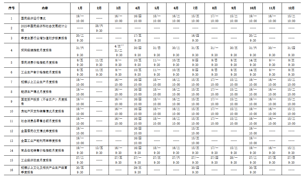 2026年国家统计局主要统计信息发布日程表。 | 序号 | 内容 | 1月 | 2月 | 3月 | 4月 | 5月 | 6月 | 7月 | 9月 | 11月 | 12月 | 8月 | 10月 | | | | | | | | | | | | | | --- | --- | --- | --- | --- | --- | --- | --- | --- | --- | --- | --- | --- | --- | --- | --- | --- | --- | --- | --- | --- | --- | --- | --- | --- | --- | | 19/- | 16/- | 16/ 16 | 18/- | 16/二 | 15/三 | 17/- | 15/ 二 | 19/- | 16/- | 15/二 | 国民经济运行情况 | 1 | | 10:00 | 10:00 | 10:00 | 10:00 | 10:00 | 10:00 | 10:00 | 10:00 | 10:00 | 10:00 | 10:00 | | | 2025年国民经济和社会发展统计公 | 28/六 | 2 | ****** | * ...