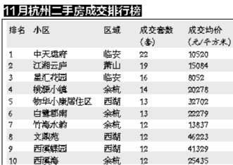 | | 11月初州二手房成交 行榜 | | | | | --- | --- | --- | --- | --- | | 排名 | 小区 | 区域 | 成交套数 | 成交均价 | | | | | 《拳) | 《关/平方米) | | 1 | 中天露府 | 临安 | 22 | 10520 | | 2 | 江相云庐 | 萧山 | 19 | 15084 | | ﺔ | 星汇花园 | 临安 | રિ | 8052 | | র্ব | 排源: 模 | 余市 | 14 | 20278 | | 5 | 物学小康屋住区 | 西 | 13 | 32702 | | ర్ | 日參那南 | 余坑 | 13 | 22279 | | 7 | 竹海水韵 | 余坑 | 12 | 13837 | | 8 | 文息玩 | 西湖 | 12 | 46223 | | ਰੇ | 用在线玩 | 西南 | 12 | 41329 | | 10 | 西濱海 | 余坑 | 12 | 25435 | 商报讯(记者周坚洪)杭州二手房,终于在年底稳住了成交连续下滑的势头。 杭州贝壳研究院的统计数据显示,11月杭州一共成交了6561套二手房,环比10月的5934套大幅上涨 ...