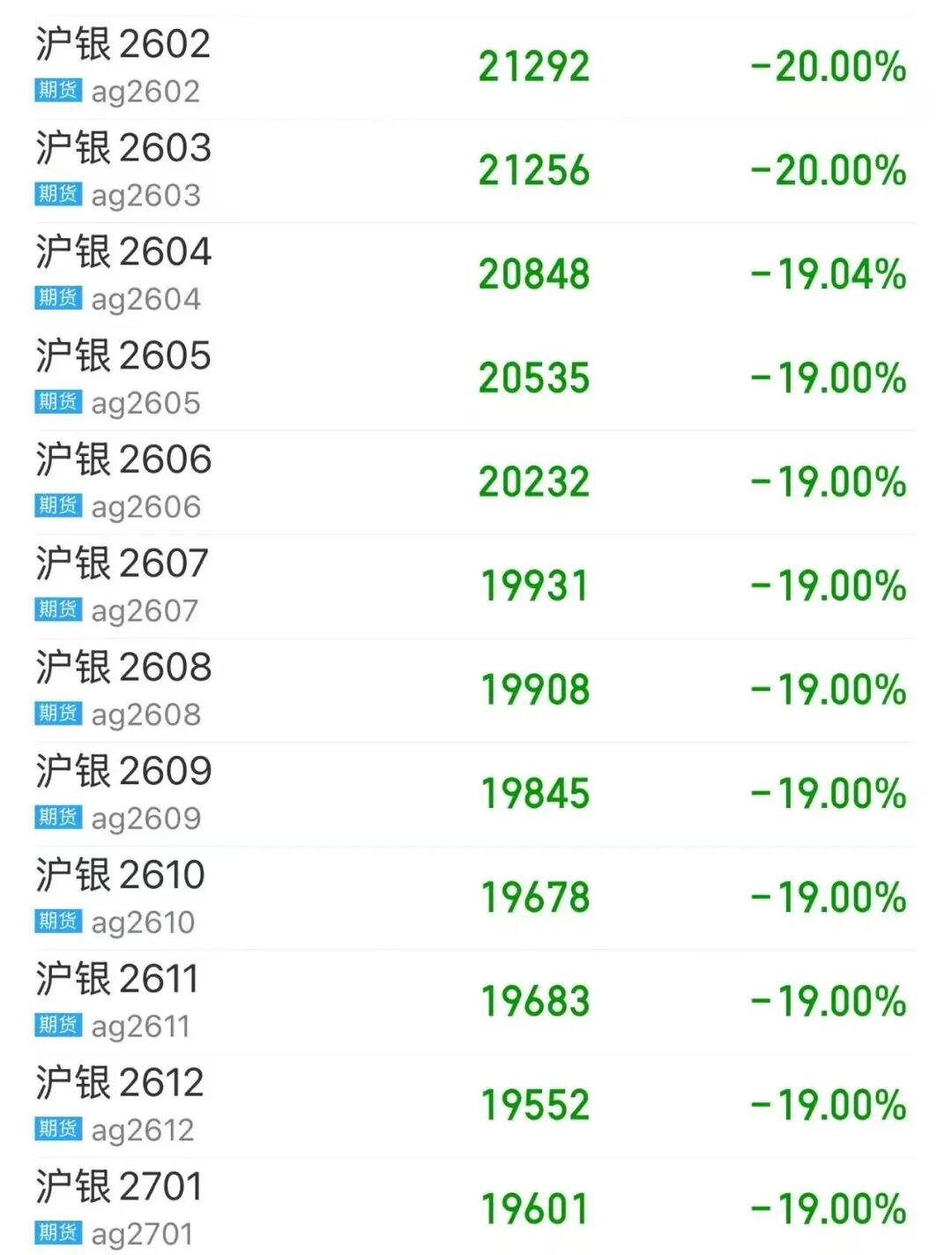 早上好,先来关注下金银。 2日夜盘,内盘白银期货延续午盘的暴跌态势。沪银期货10个合约开盘后不久全部跌停。 | 沪银 2602 | 21292 | -20.00% | | --- | --- | --- | | 期货 ag2602 | | | | 沪银 2603 | 21256 | -20.00% | | 期货 ag2603 | | | | 沪银 2604 | 20848 | - 19.04% | | 期货 ag2604 | | | | 沪银 2605 | 20535 | - 19.00% | | 期货 ag2605 | | | | 沪银 2606 | 20232 | - 19.00% | | 期货 ag2606 | | | | 沪银 2607 | 19931 | - 19.00% | | 期货 ag2607 | | | | 沪银 2608 | 19908 | - 19.00% | | 期货 ag2608 | | | | 沪银 2609 | 19845 | - 19.00% | | 期货 ag2609 | | | | 沪银 2610 | 19678 | -19.00% | | 期货 ag2610 | | | ...