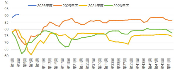 禽畜养殖下游补充库存,深加工消费同比下降 截至1月15日,生猪自繁自养模式下的养殖利润为25.77元/头,较上周升高26元/头,外购仔猪模式下 养殖利润为-100.5元/头,较上周升高29元/头。蛋鸡养殖利润-0.04元/斤,略高于前周的-0.28元/ 斤。饲料厂通过拍卖玉米补充库存,物理库存天数以上涨为主,但是还未出现集中补库的情况。截至1 月15日,全国饲料企业平均库存可用天数为31.15天,较上周增加1.05天,环比上涨3.49%,同比下跌 6.71%。 截至1月14日,全国12个地区96家主要玉米加工企业库存总量为359万吨,环比增加1.41%,虽然库存增 加,但还是近3年同期最低的,东北地区深加工企业继续提价收购,华北地区玉米到货量平稳。1月8日 至1月14日,全国149家主要深加工企业共消耗玉米135.59万吨,比上周减少2.59万吨,低于2025年同期 的141万吨。截至1月9日,黑龙江地区玉米制乙醇利润在-742元/吨,低于2025年同期的-377元/吨, 玉米淀粉加工利润在-79元/吨,低于2025年同期的5元/吨。尽管淀粉价格小幅上涨,但是玉米价格偏 强,加工亏损扩大,淀粉库存高,下游采购 ...