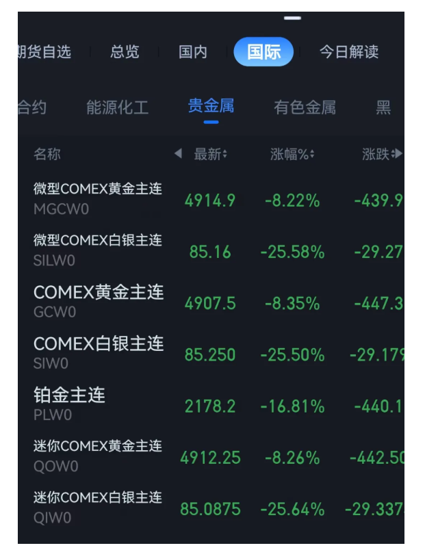 昨夜今晨,黄金、白银价格继续大幅下跌。纽约黄金期价一度跌破4800美元/盎司关口,跌幅超过 10%;白银期价一度跌破80美元/盎司关口,跌幅超过30%。截至收盘,纽约黄金下跌8.35%,报4907.5 美元/盎司;现货黄金重挫9%,报4891.43美元/盎司;纽约白银下跌25.5%,报85.25美元/盎司。国内夜 盘方面,沪金收跌9.83%,沪银收跌17%。 | 脂自选 总览 | 国内 | 星际 | 今日解读 | | --- | --- | --- | --- | | 合约 能源化工 | 贵金属 | 有色金属 | | | 名称 | ◀ 最新: | 涨幅%; | 涨跌 # | | 微型COMEX黄金主连 MGCW0 | 4914.9 | -8.22% | -439.9 | | 微型COMEX白银主连 SILWO | 85.16 | -25.58% | -29.27 | | COMEX黄金主连 GCW0 | 4907.5 | -8.35% | -447.3 | | COMEX白银主连 SIWO | 85.250 | -25.50% | -29.179 | | 铂金主连 PLWO | 2178.2 | -16.81 ...