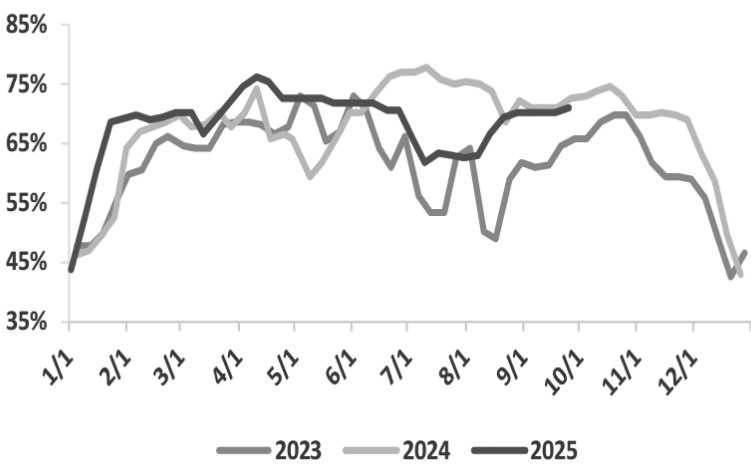 旺季钢厂生产保持平稳,虽然刚需带来一定支撑,但锰硅整体需求表现偏弱。截至10月10日当周,钢联 247家钢厂高炉开工率和产能利用率分别为84.27%和90.55%,同比分别增长3.48个百分点和3.04个百分 点。 同期,钢材产量变化不大。钢联五大材周产量最新值为863.31万吨,较国庆假期前微降3.76万吨;对应 的五大材折锰硅需求量为12.21万吨,延续9月以来的偏弱态势,且已低于去年同期。 国庆长假过后,锰硅价格呈低位震荡态势,期现价格均有所走弱。主力合约最低下探至5710元/吨,逼 近前期低点;同期主流地区现货价格下跌1~20元/吨。 供应收缩有限 当前锰硅市场运行逻辑逐步回归产业基本面。据钢联统计,9月全国锰硅日均产量为29946.8吨,同比增 长18.82%。在高供应压力下,锰硅价格开启下行走势,目前已回吐前期大部分涨幅。 锰硅价格持续走低已倒逼部分企业减产。截至10月10日当周,钢联统计的全国187家独立锰硅企业开工 率为43.19%,日均产量为29175吨。尽管自9月中旬以来,两者均自高位回落,但降幅不大,仍处于年 内较高水平。 分地区来看,主产区企业生产积极性依然较高。其中,内蒙古地区日均产 ...