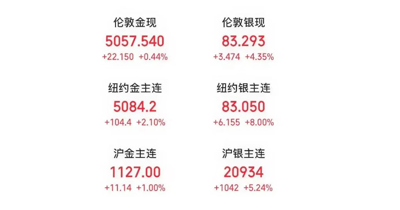 今天凌晨, 白银价格大幅反弹。截至今晨收盘,纽约期银主力合约暴涨8%,伦敦银现货价格大涨4.35%。 | 伦敦金现 | 伦敦银现 | | --- | --- | | 5057.540 | 83.293 | | +22.150 +0.44% | +3.474 +4.35% | | 纽约金主连 | 纽约银主连 | | 5084.2 | 83.050 | | +104.4 +2.10% | +6.155 +8.00% | | 沪金主连 | 沪银主连 | | 1127.00 | 20934 | | +11.14 +1.00% | +1042 +5.24% | 这位最高领袖说:"国家力量与其说源自导弹与飞机,不如说源自民族的意志与坚守。(希望伊朗民众)再次展现 这种意志,挫败敌人。" 金银价格反弹还是反转? 对于内外盘贵金属价格大幅反弹,广发期货贵金属研究员叶倩宁认为,主要有两方面原因:一是数据显示,中国1 月末黄金储备约2307.6吨,环比增加1.3吨,为连续15个月增持,为市场注入了信心;二是今年1月全球黄金ETF持 仓净流入190亿美元,创下单月历史新高,其资产管理规模更是达到6690亿美元,环比增长20%,创下 ...