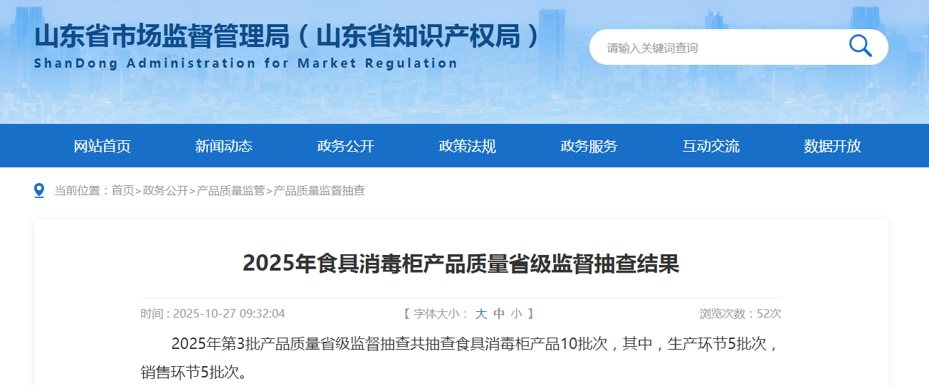 山东省市场监管局发布2025年食具消毒柜产品质量省级监督抽查结果