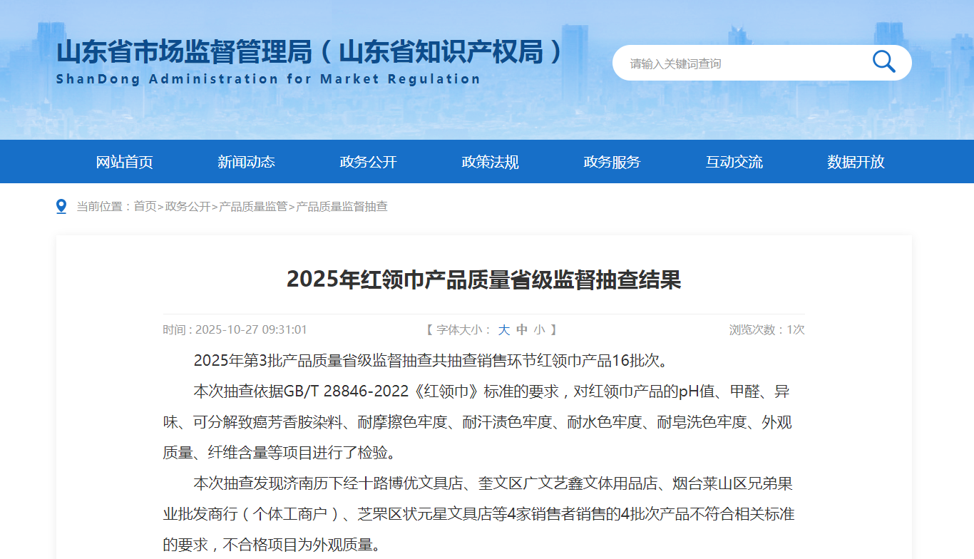 山东省市场监管局发布2025年红领巾产品质量省级监督抽查结果