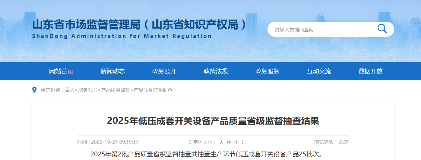 山东省市场监管局发布2025年低压成套开关设备产品质量省级监督抽查结果