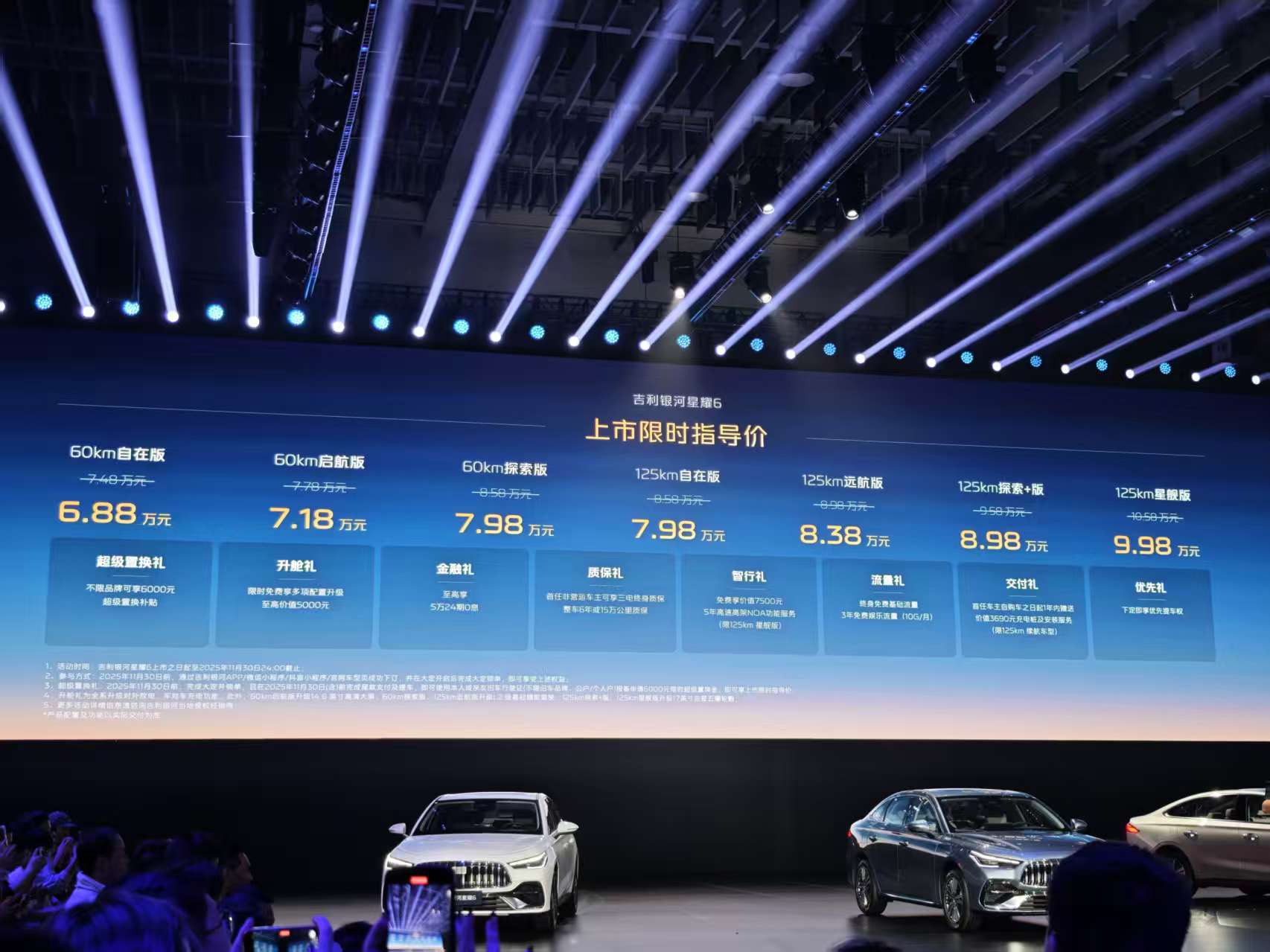 10月30日,吉利银河星耀6上市,推出60km自在版、60km启航版、60km探索版、125km自在版、125km远航版、125km探索+版、125km星舰版7款车型,限 时指导价6.88万元-9.98万元。 三大成本最省,一步到位 新一代吉利银河星耀6以6.88万元起切入主流家轿市场,标配银河Flyme Auto智能座舱系统、神盾电池安全系统、棉花糖座椅、10.2英寸仪表、倒车影像等实 用配置,大幅降低购车成本。新一代雷神AI电混2.0系统,集成量产热效率47.26%的电混专用发动机平台,以及基于AI场景引擎的动力域智能体"星睿AI云动 力2.0",能识别1000多种细分场景,根据个人的驾驶习惯、路况、环境湿度、温度等各种条件,提前规划节省能耗的方案,在CLTC工况下实现最低 2.8L/100km馈电油耗。长达1700公里的CLTC综合续航,125km超长纯电续航,覆盖日常通勤场景。在曼谷拥堵的城市道路中,星耀6跑出百公里2.6L的馈电 油耗,而在西安、上海、北京等城市实测中,油耗稳定在2.6-2.9L之间。 一台懂生活的家轿,不仅要买得起、开得省,更要养得轻松。吉利银河星耀6将产品价值延伸到用车全周期,以 ...