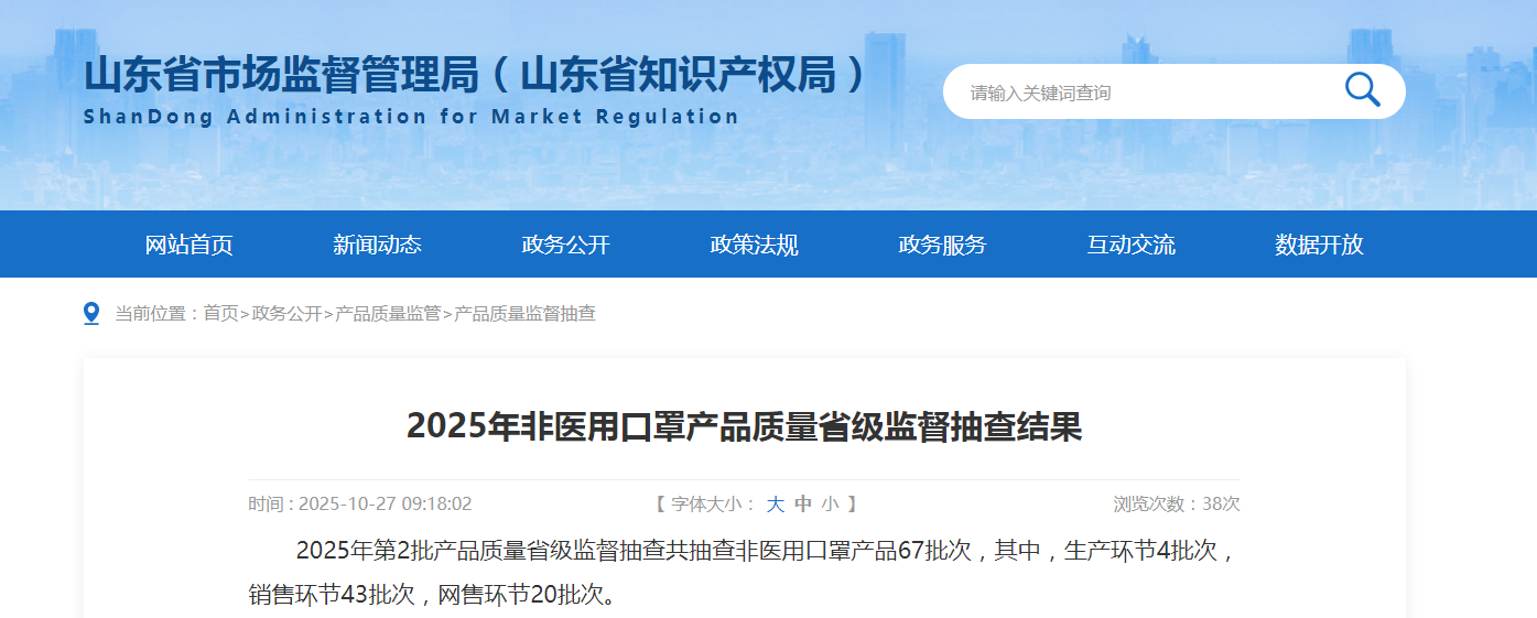 山东省市场监管局发布2025年非医用口罩产品质量省级监督抽查结果