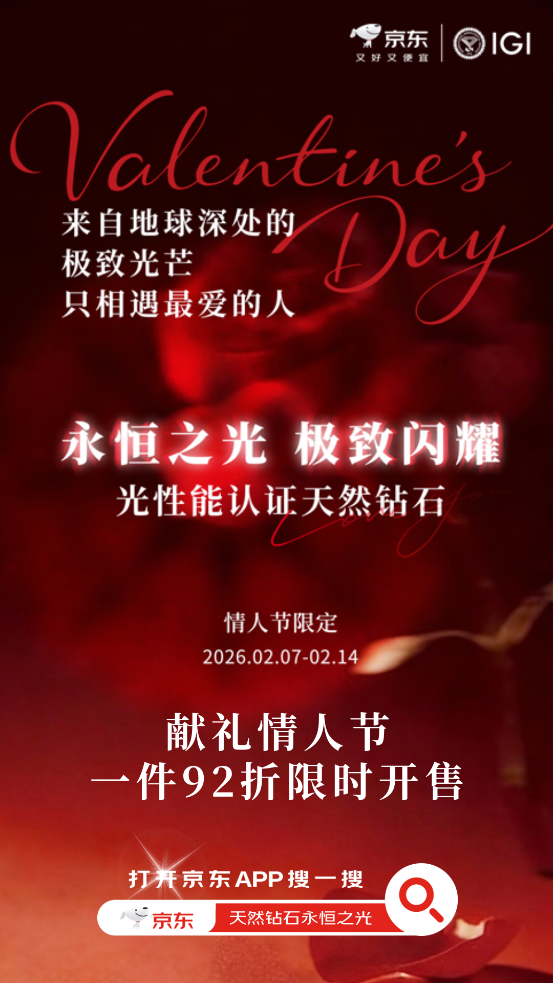 长期以来,普通消费者在选购钻石时,虽然能直观判断克拉数、切工等维度,却不容易评估钻石的闪亮程度。为此,京东珠宝联合IGI国际宝石研究 院,正式推出"永恒之光"光性能认证鉴定报告,以专业数据帮助消费者挑选闪耀出众的天然钻石。 同时,京东联合喜钻、佐卡伊、钻石世家等钻石品牌,限量发售符合该光性能认证的钻石,并带来一件92折优惠。2月7日至2月14日,打开京东APP搜 索"天然钻石永恒之光"即可选购,让每一份心意都闪耀有据、送礼更显诚意。 | INTERNATIONAL GEMOLOGICAL INSTITUTE IQI SPECIMEN Report updated blog : tululute ory 20. 200 Travil Nav El ~ *** | ØIGI g ages 0.41 CARA t ema 1878 1978 1972 1972 (100%) 100% 190 recollism Raci eximbols indo Grown symbols ind 8 发展先 | 您IGI ww.igi.org INTERNETOHUS ka BECART! B LINEAR B GEMOLOG ...