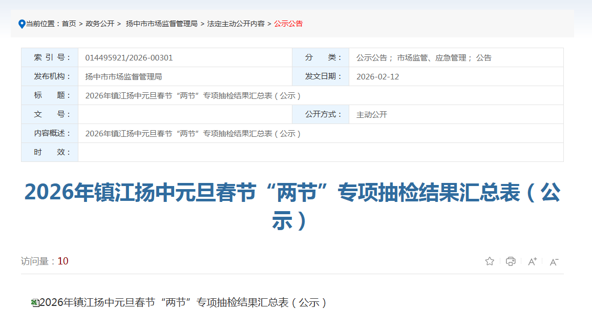 2026年江苏镇江扬中元旦春节“两节”专项抽检结果汇总表(公示)