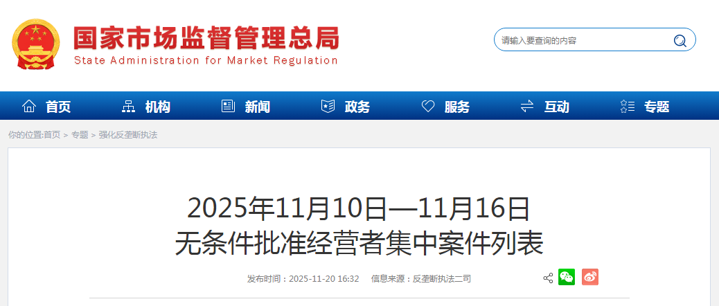 2025年11月10日—11月16日无条件批准经营者集中案件列表