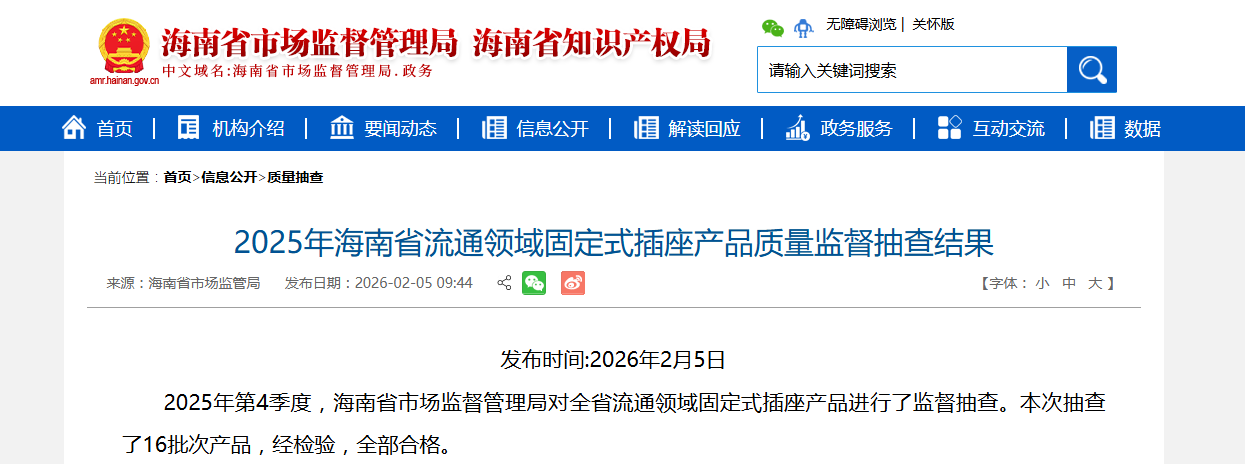 2025年海南省流通领域固定式插座产品质量监督抽查结果公布