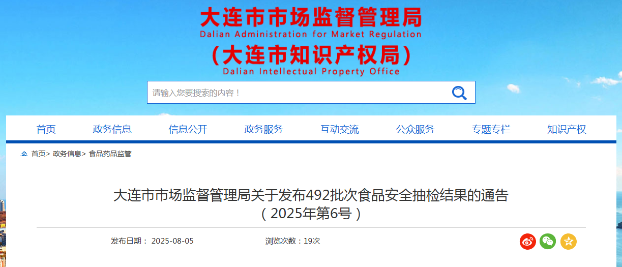 辽宁省大连市市场监督管理局关于发布492批次食品安全抽检结果的通告(2025年第6号)