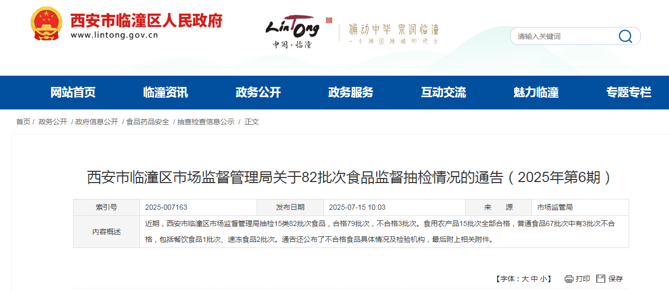 西安市临潼区市场监督管理局关于82批次食品监督抽检情况的通告(2025年第6期)