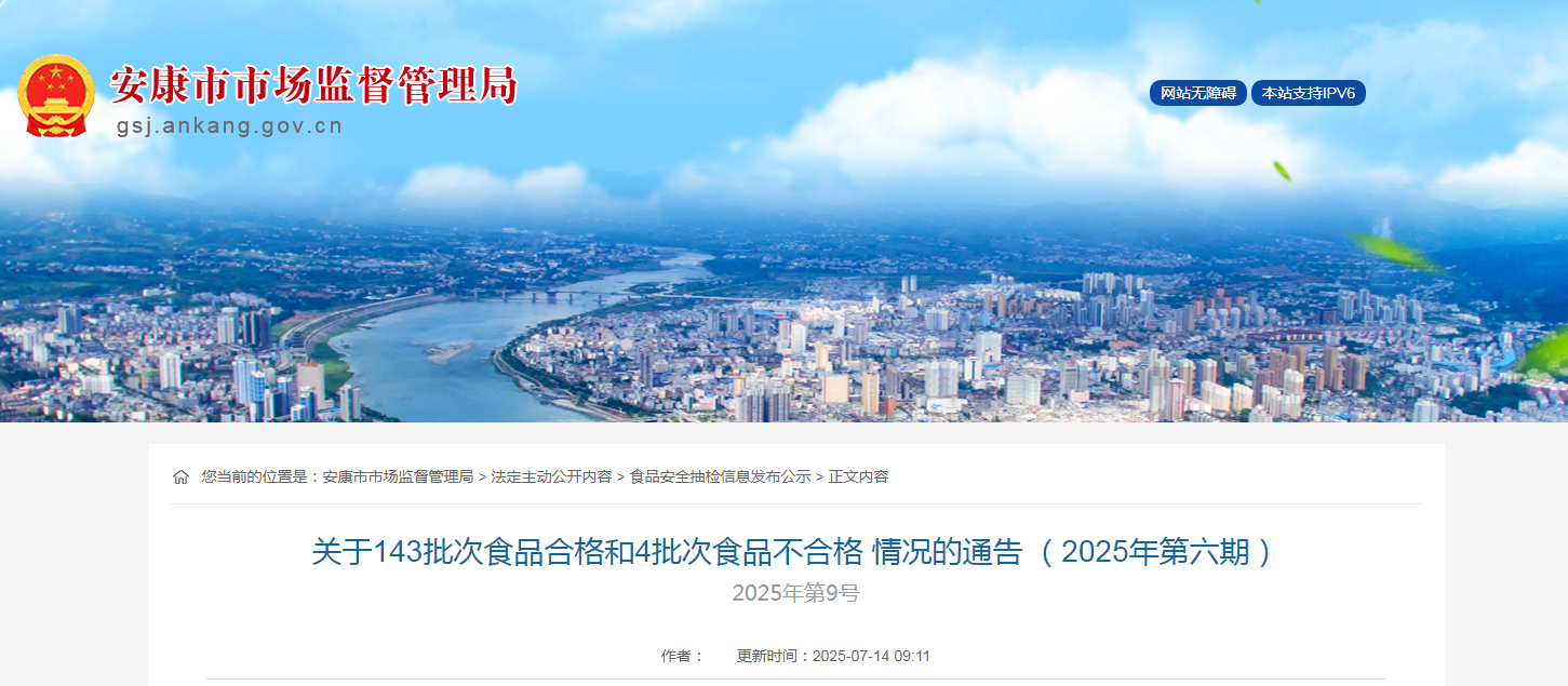陕西省安康市市场监督管理局关于143批次食品合格和4批次食品不合格情况的通告(2025年第六期)