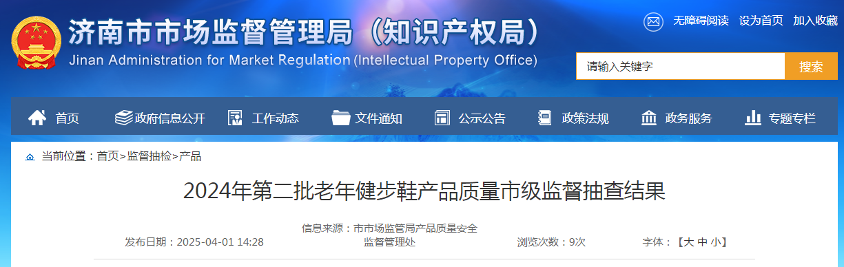 济南市市场监管局公布2024年第二批老年健步鞋产品质量市级监督抽查结果