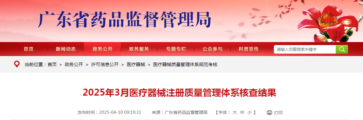 【广东】2025年3月医疗器械注册质量管理体系核查结果