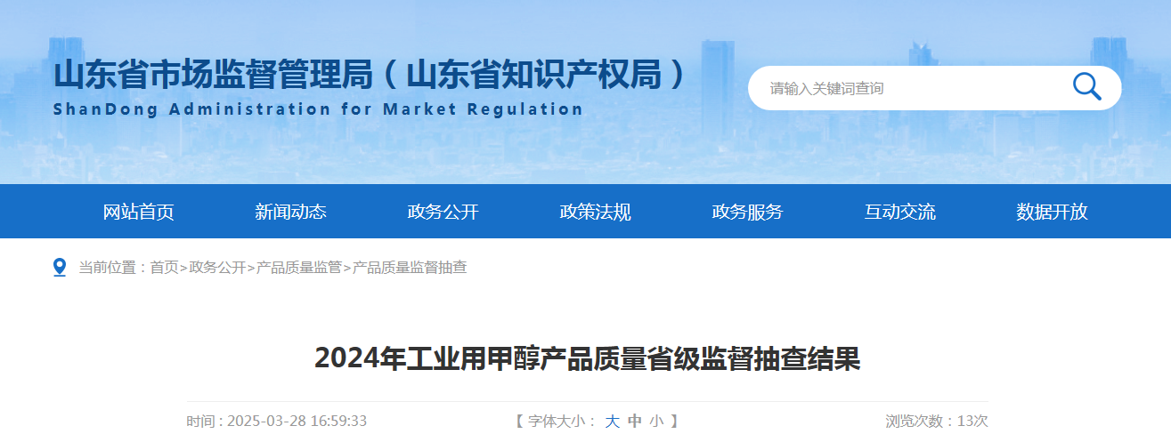 山东省市场监管局公布2024年工业用甲醇产品质量省级监督抽查结果