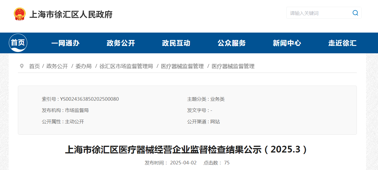 上海市徐汇区医疗器械经营企业监督检查结果公示(2025.3)