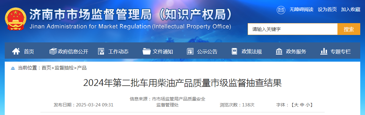 济南市市场监管局公布2024年第二批车用柴油产品质量市级监督抽查结果