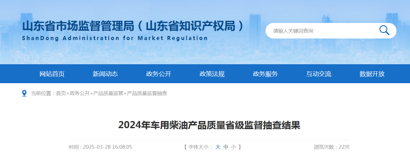 山东省市场监管局公布2024年车用柴油产品质量省级监督抽查结果