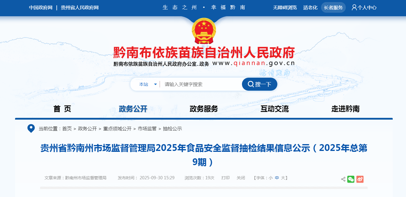 贵州省黔南州市场监督管理局2025年食品安全监督抽检结果信息公示(2025年总第9期)