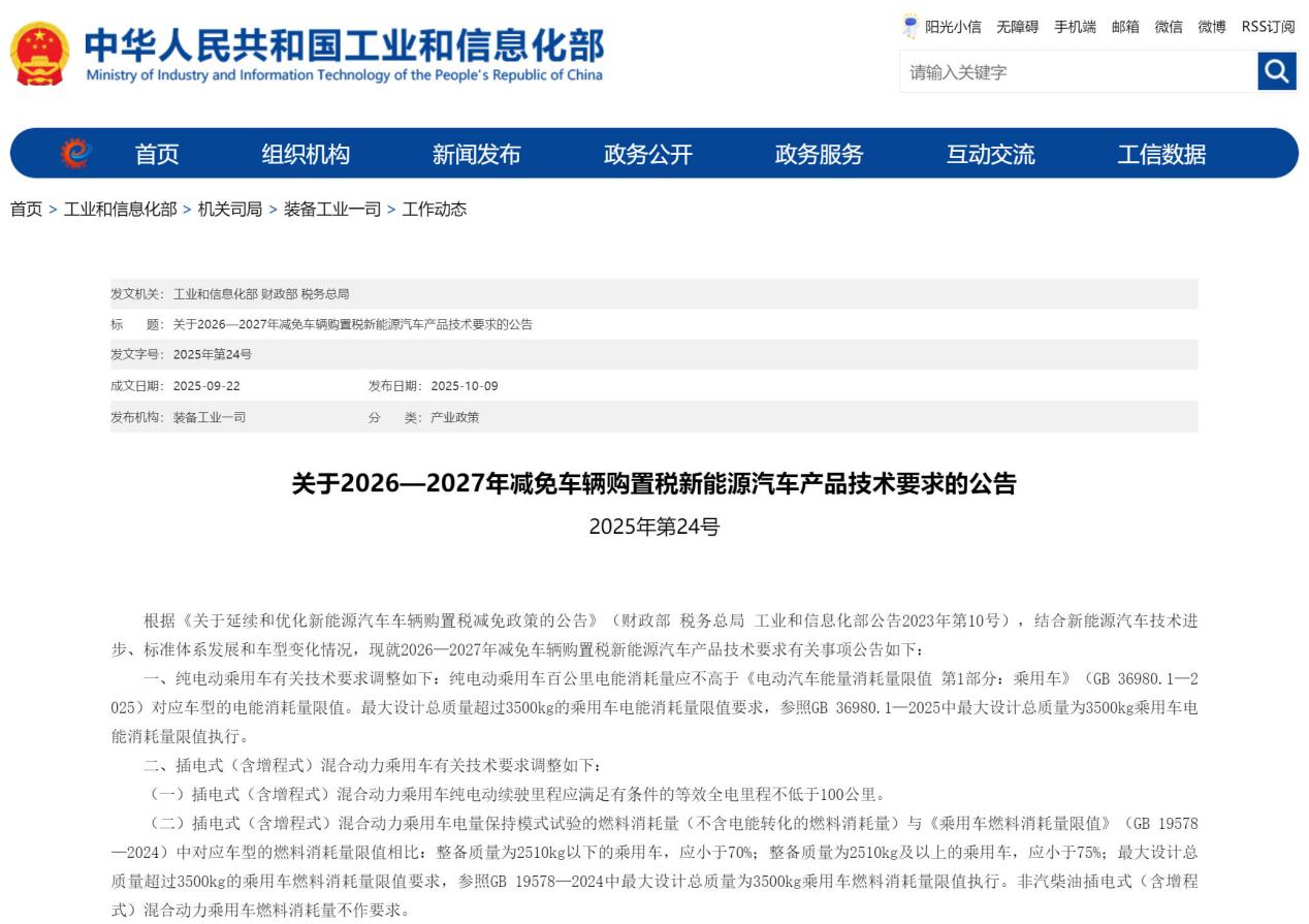 日前,工业和信息化部、财政部、税务总局三部门联合发布公告,明确2026-2027年减免车辆购置税新能源汽车产品的新技术要求。2026年1月1日起, 新能源汽车购置税从全额减免调整为"减半征收,单车最高减税额为1.5万元"。 | 发文机关: 工业和信息化部 财政部 税务总局 | | | --- | --- | | 标 题:关于2026—2027年减免车辆购置税新能源汽车产品技术要求的公告 | | | 发文字号: 2025年第24号 | | | 成文日期:2025-09-22 | 发布日期:2025-10-09 | | 发布机构: 装备工业一司 | R 类:产业政策 | 此次新规最具突破性的变化,在于首次明确了2026年后减免税车型的技术准入门槛,通过标准升级倒逼产业高质量发展。其中,最显著的变化是对插电 式(含增程式)混合动力乘用车的纯电续航里程提出要求,从目前的43公里跃升至100公里,提升幅度达132%。 这意味着目前在售的大量纯电续航在43公里-100公里之间的插混车型,尤其是部分主打低价策略的入门级车型,将无法在2026年享受购置税减免。 此外,2026年起新能源汽车购置税减免政策将强化能耗指标要求,纯 ...