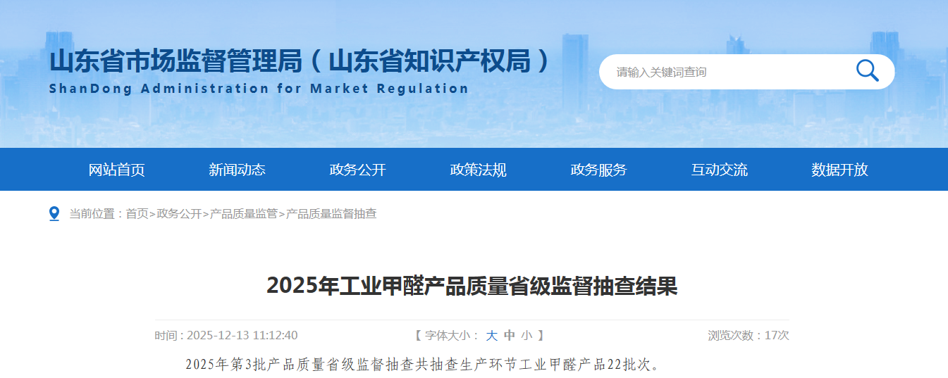 山东省市场监督管理局公布2025年工业甲醛产品质量省级监督抽查结果