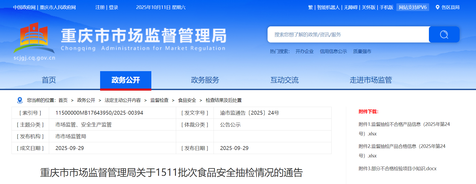 | | 政务公开 | 政务服务 | 互云 | | --- | --- | --- | --- | | 首页 | | | | | [ 索引号] | 11500000MB17643950/2025-00394 | [ 发文字号 ] | 渝市监通告〔2025〕24号 | | --- | --- | --- | --- | | [ 手题分类] | 市场监管、安全生产监管 | [ 体裁分类] | 公告公示 | | [ 发布机构 ] | 市市场监管局 | | | | [ 成文日期 ] | 2025-09-29 | [ 发布日期 ] | 2025-09-29 | 近期,重庆市市场监督管理局组织抽检饼干、餐饮食品、茶叶及相关制品、炒货食品及坚果制品、蛋制品、淀粉及淀粉制品、豆制品、方便食品、糕点、罐 头、酒类、冷冻饮品、粮食加工品、肉制品、乳制品、食糖、食用农产品、食用油、油脂及其制品、蔬菜制品、薯类和膨化食品、水产制品、水果制品、速 冻食品、糖果制品、调味品、饮料等26类食品1511批次样品。抽样检验项目合格样品1492批次,不合格样品19批次。现通告如下: 一、不合格产品情况 (一)开州区亚舒百货超市销售的、标称临沂嘉仕 ...