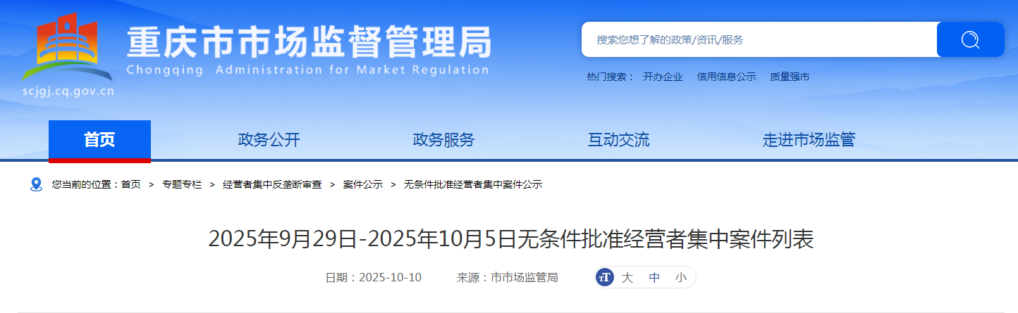 日期:2025-10-10 来源:市市场监管局 搜索您想了解的政策/资讯/服务 热门搜索: 开办企业 信用信息公示 sciai.ca.gov 首页 政务公开 政务服务 互动交流 走 您当前的位置:首页 > 专题专栏 > 经营者集中反垄断审查 > 案件公示 > 无条件批准经营者集中案件公示 0 2025年9月29日-2025年10月5日无条件批准经营者集中案件 (1 大 中 小 ) | 2025年9月29日-2025年10月5日 | | | | | --- | --- | --- | --- | | 无条件批准经营者集中案件列表 | | | | | ক 특 | 案件名称 参与集中的经营者 | | 审结时间 | | | 成都千木成林新材料有限公司、神钢商事株式会社、神钢投资有限 成都干木成林新材料有限公司与神钢商事株式会社等新设合营企业案 | | 2025年9月 | | | 公司 | | 29日 | | 2 | 东方电气投资管理有限公司与中银资本私募基金管理(北京)有限公 床方电气投资管理有限公司、中银资本私募基金管理(北京)有限 2025年9月 同新设合营企业案 公司 | | 29日 | | | 重庆渝富控股集 ...