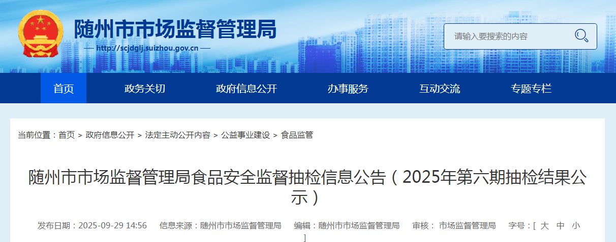 湖北省随州市市场监督管理局食品安全监督抽检信息公告(2025年第六期抽检结果公示)
