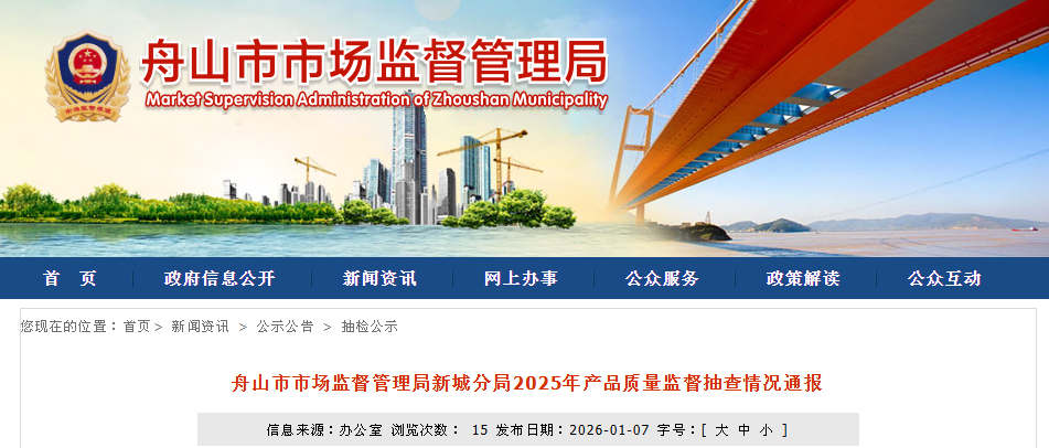 浙江省舟山市市场监督管理局新城分局通报2025年产品质量监督抽查情况