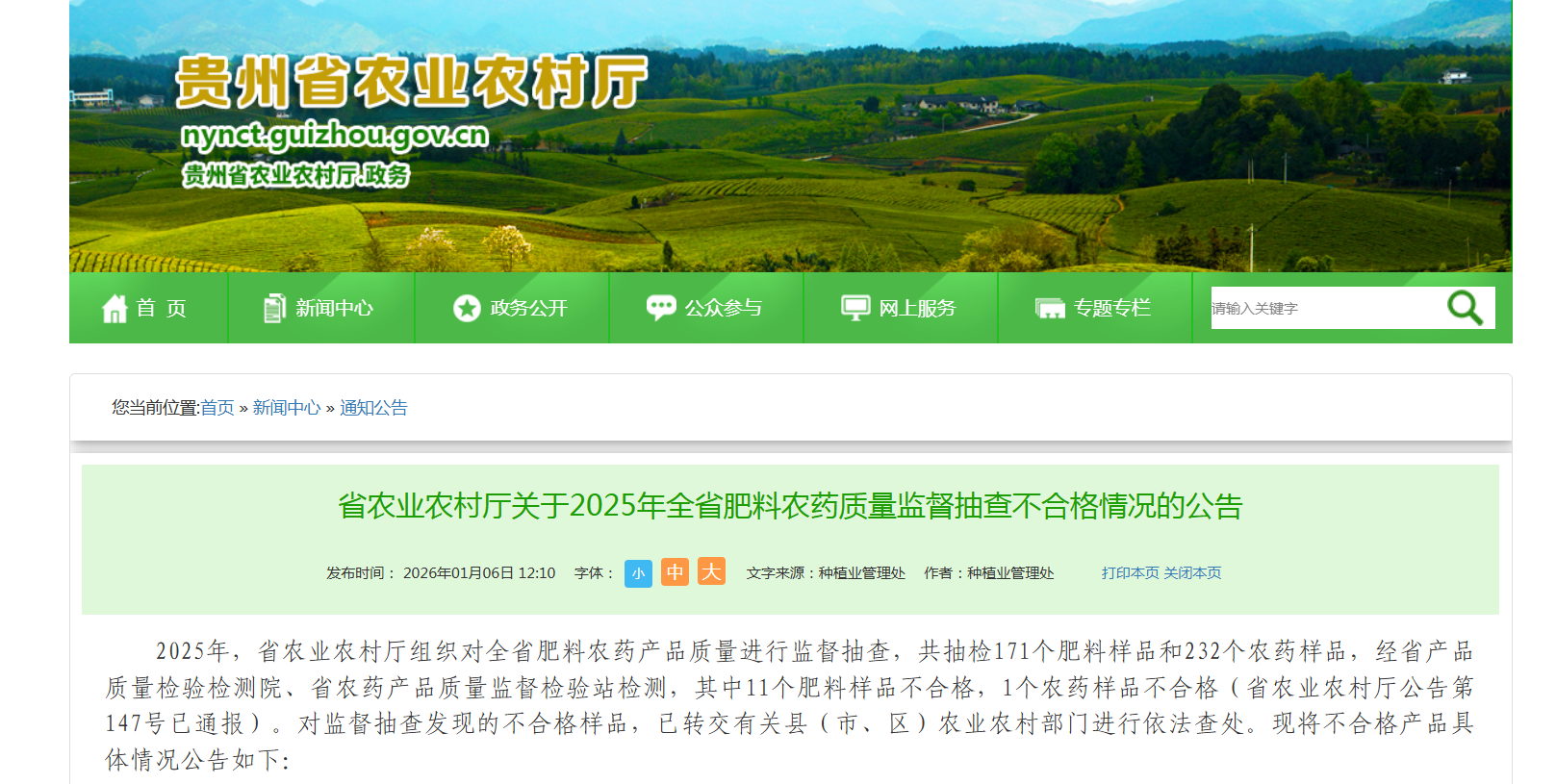 贵州省农业农村厅发布2025年全省肥料农药质量监督抽查不合格情况公告
