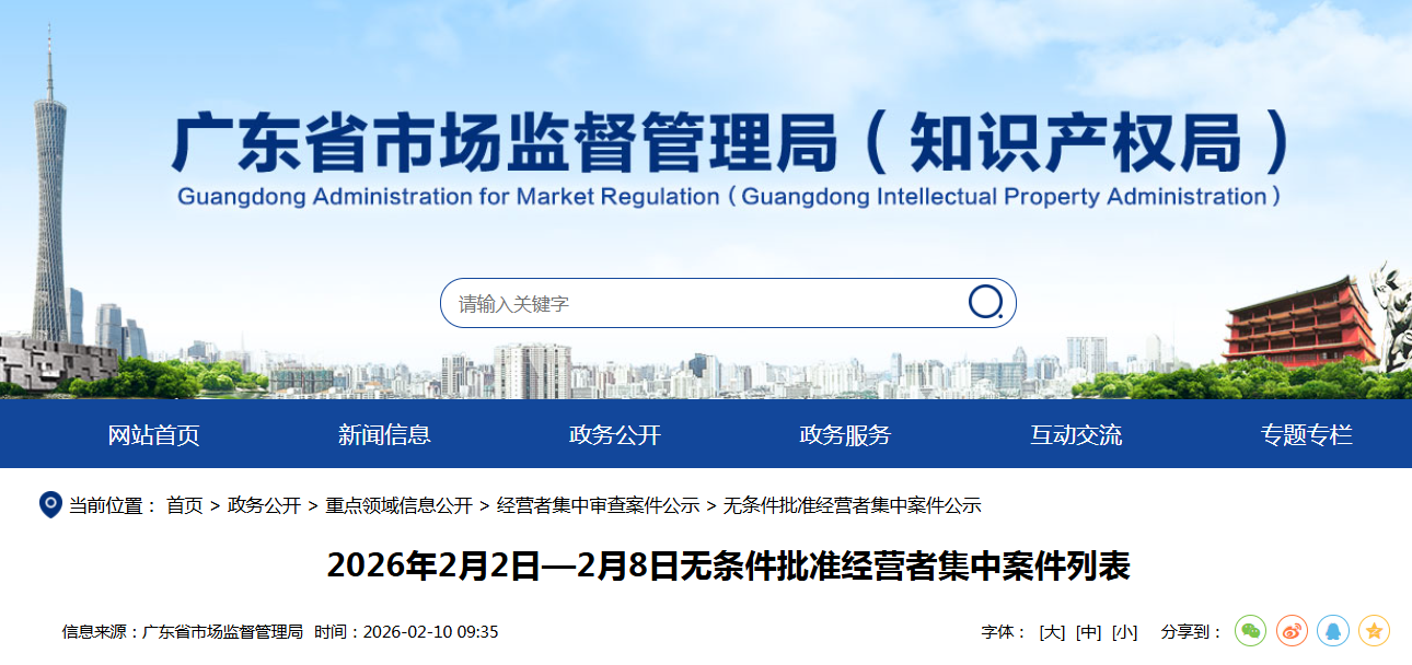字体: [大] [中] [小] 分享} | | 滁州市城市投资控股集团有限公司收购广州教昌科技股份有限公司股权 滁州市城市投资控股集团有限公司、广州教昌科技股份有限公 2026年2月4 | | --- | --- | | 序 案件名称 号 案 | 参与集中的经营者 审结时间 | 2026年2月2日—2月8日无条件批准经营者集中案件列表 信息来源:广东省市场监督管理局 时间:2026-02-10 09:35 Guangdong Administration for Market Regulation ( Guangdong Intellectual Property Ad 请输入关键字 网站首页 新闻信息 政务公开 政务服务 互动交流 ♀ 当前位置: 首页 > 政务公开 > 重点领域信息公开 > 经营者集中审查案件公示 > 无条件批准经营者集中案件公示 ...