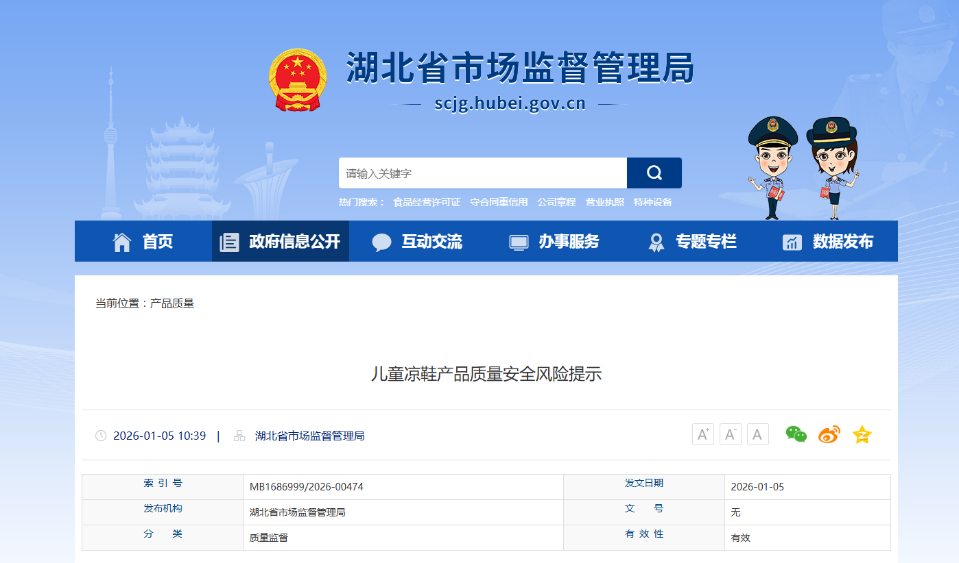 湖北省市场监管局发布儿童凉鞋产品质量安全风险提示