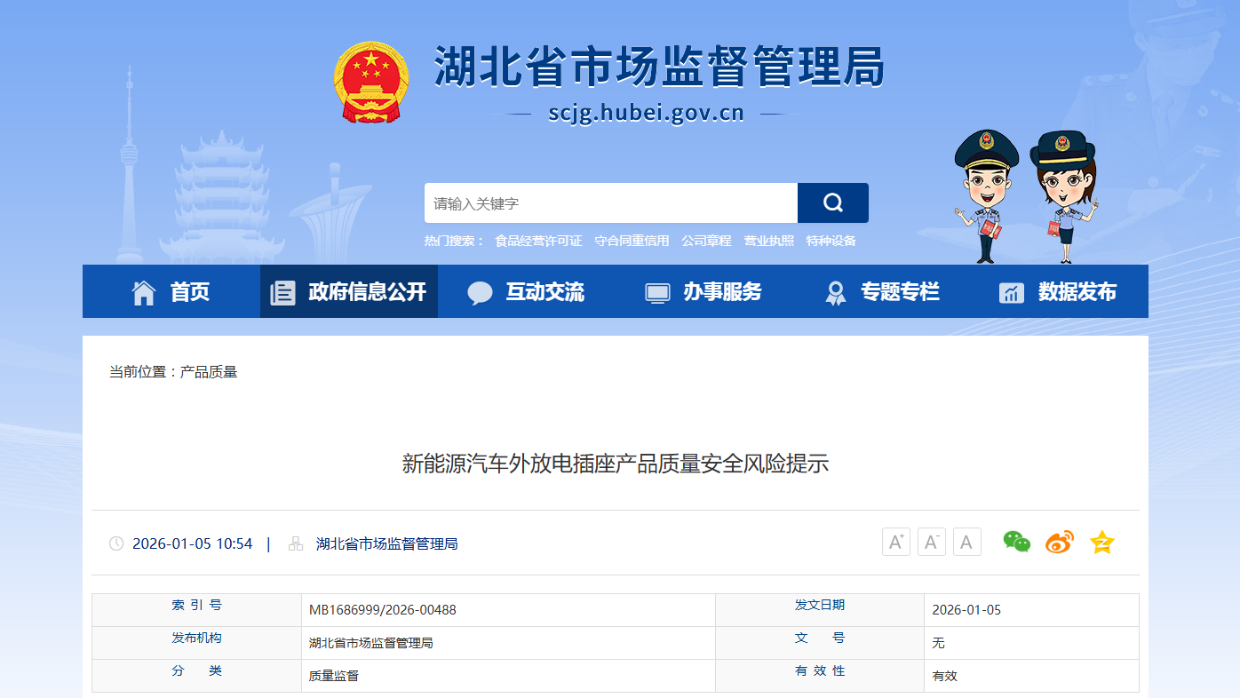 湖北省市场监管局发布新能源汽车外放电插座产品质量安全风险提示