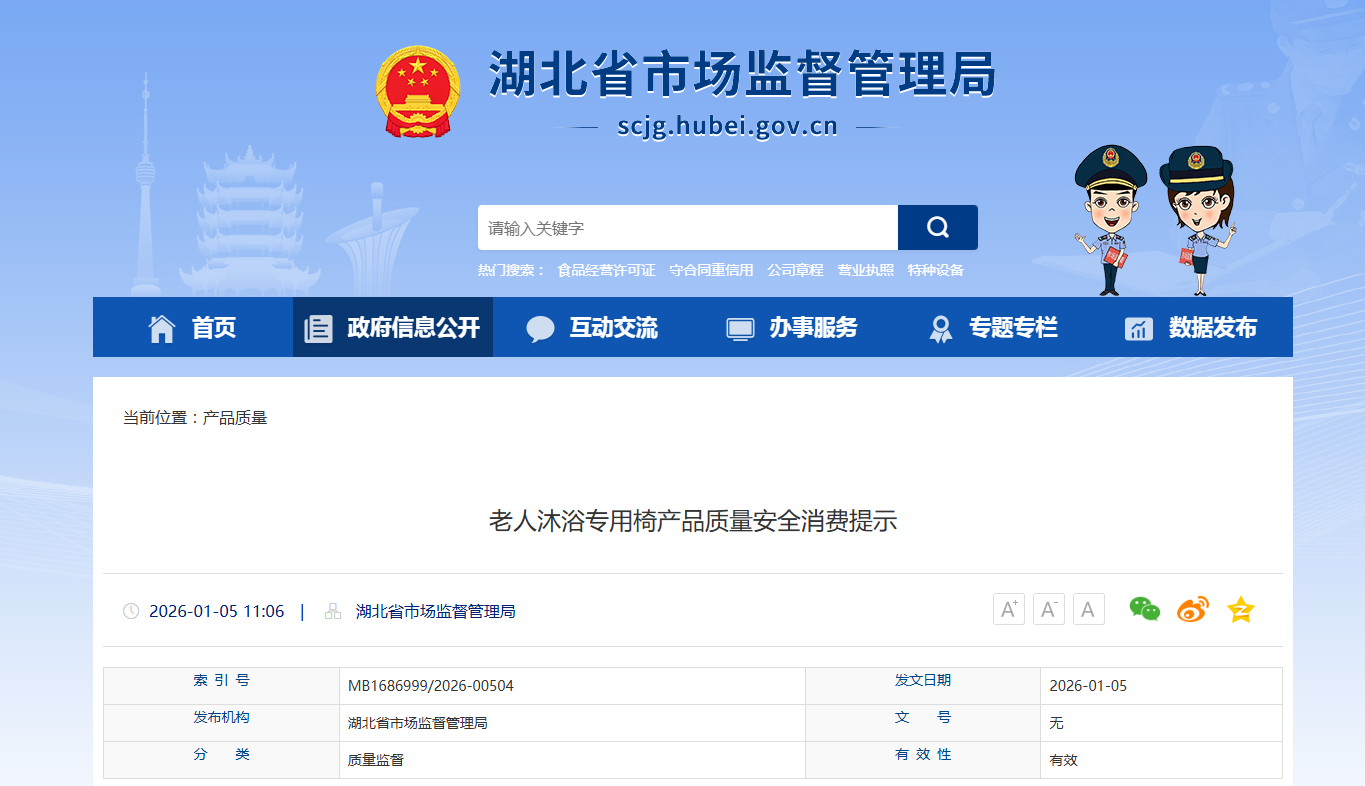 湖北省市场监管局发布老人沐浴专用椅产品质量安全消费提示