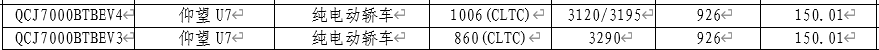 动力方面,插电混动版依旧搭载2.0T发动机与四电机组成的插电混动系统,其中前电机最大功率提升至260kW,电动机总功率可达1000kW,纯电续航 分别为200km和220km。纯电动版车型的电机预计同步升级,同时电池容量扩大至150.01kWh,续航里程分别为860km和1006km。 新一期《减免车辆购置税的新能源汽车车型目录》披露了新款仰望U7纯电版续航信息,将搭载容量为150.01kWh的电池组,CLTC纯电续航分别为 1006km和860km;插电混动版车型继续搭载52.3987kWh电池,纯电续航里程分别为200km和220km。 | QCJ7000BTBEV4< | | 仰望 U747 | 纯电动轿车( | 1006 (CLTC) < | 3120/31956 | 926 | 150.014 | | | --- | --- | --- | --- | --- | --- | --- | --- | --- | | QCJ7000BTBEV3< | | 仰望 U7e | 纯电动轿车(1 | 860 (CLTC) < | 3290< | 926 | 150.014 | | | OCJ7200BTHEV ...