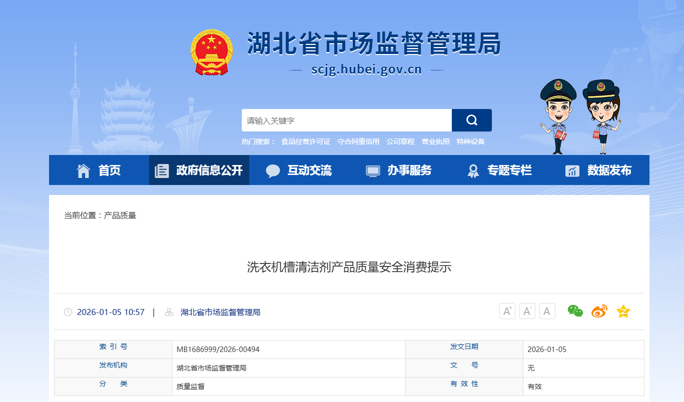 湖北省市场监管局发布洗衣机槽清洁剂产品质量安全消费提示