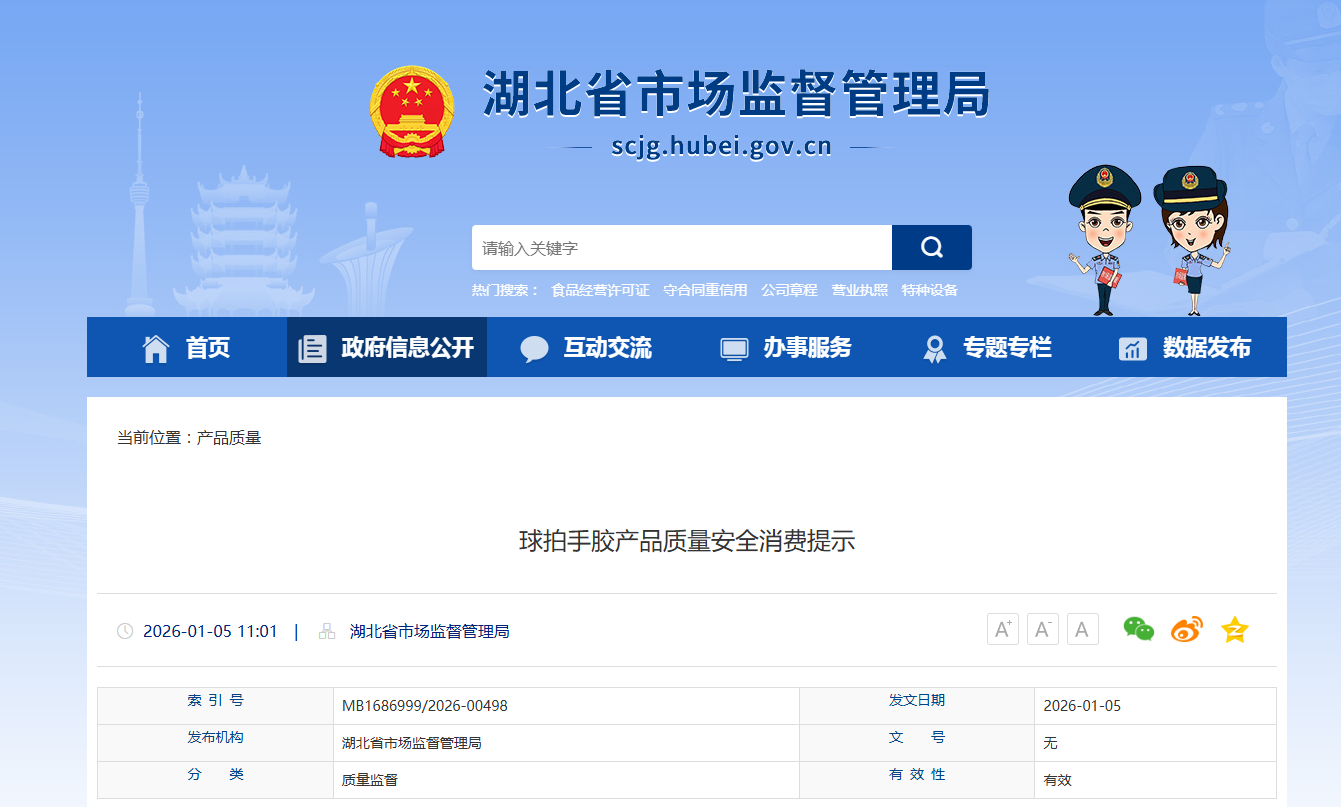 湖北省市场监管局发布球拍手胶产品质量安全消费提示