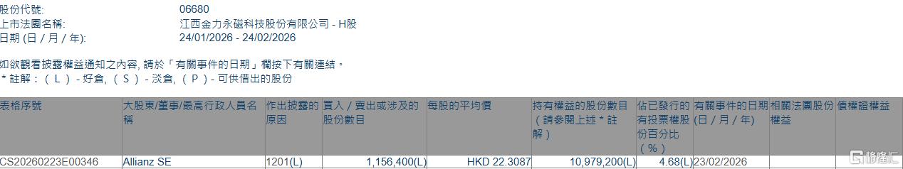 格隆汇2月24日丨根据联交所最新权益披露资料显示,2026年2月23日,金力永磁(06680.HK)遭Allianz SE在场内以每股均价22.3087港元减持115.64万股,涉 资约2579.8万港元。 减持后,Allianz SE最新持股数目为1097.92万股,持股比例由5.17%下降至4.68%。 | 股份代號: | | --- | | 上市法國名稱: 日期 草 | | 表格序號 | 大股東/董事/最高行政人員名 作出披露的 買入 / 賣出或涉及的 每股的平均價 | | | | 持有權益的股份數目 佔已發行的 有關事件的日期 相 | | | --- | --- | --- | --- | --- | --- | --- | | | 股份數目 | 泉内 | | | (請參閱上述*註 有投票權股(日 / 月 / 年) 權 | | | | | | | | al 份自分比 | | | CS20260223E00346 | Allianz SE | 1201(L) | 1.156.400(L | HKD 22.3087 | 10.979.200(L) | 4.68(L)23/02/2026 | ...