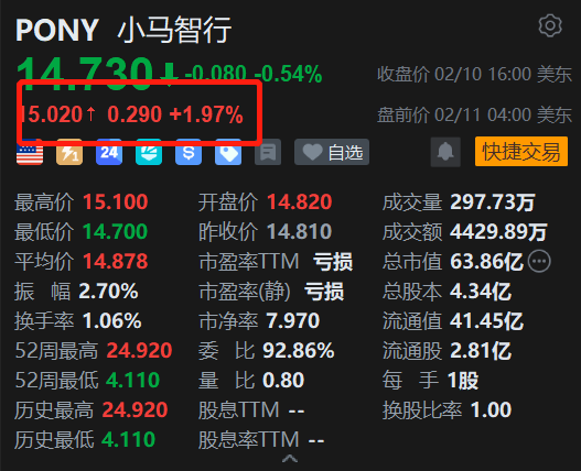 Group 1 - The core viewpoint of the news is that Pony.ai's stock price increased by 2.6% in Hong Kong, leading to a pre-market rise of approximately 2% in its US stock [1] - Pony.ai has been included in the MSCI China Index, which will take effect after the market closes on February 27. This inclusion is seen as a significant milestone for the company, indicating recognition in the international capital market [1] - The benefits of being included in the MSCI China Index are multifaceted, primarily enhancing liquidity, optimizing the investor structure, and improving the company's reputation [1] Group 2 - As of February 10, the closing price of Pony.ai was $15.020, with a pre-market price of $15.310, reflecting a 1.97% increase [2] - The total market capitalization of Pony.ai is approximately $6.386 billion, with a total share count of 434 million [2] - The stock has experienced a 52-week high of $24.920 and a low of $4.110, indicating significant volatility in its price [2]