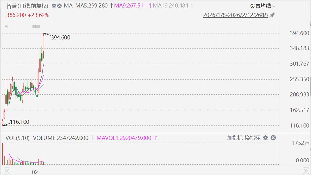 另外,智谱于2月12日发布GLM Coding Plan价格调整函,因市场需求增长,用户规模与调用量提升,公司加大算力与模型优化投入,产品能力持续升级; 公司决定对套餐价格体系进行结构性调整,取消首购优惠,保留按季按年订阅优惠,套餐价格整体涨幅自30%起,已订阅用户价格保持不变。 | 智谱(日线,前复权) * 3 MA MA5:299.280 ↑ MA9:267.511 ↑ MA19:240.484 1 | | | | 设置均线~ | | | --- | --- | --- | --- | --- | --- | | | 386.200 +23.62% | | 2026/1/8-2026/2/12(26根) ★ | | | | | 400 章章 | | | | 394.600 | | | | 394.600 | | | | | | | | | | 348.183 | | | | | | | 301.767 | | | | | | | 255.350 | | | | | | | 208.933 | | | | | | | 162.517 | | | 116.100 | | | | 116.100 | | | | ...