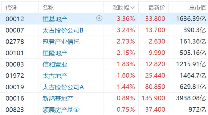 2月20日,港股市场部分本地地产股走强,其中,恒基地产、太古股份公司B涨超3%,冠君产业信托、 恒隆地产涨超2%,信和置业、太古地产、太古股份公司A涨超1%。 | 代码 | 名称 | | 涨跌幅 √ | 最新价 | 总市值 | | --- | --- | --- | --- | --- | --- | | 00012 | 恒基地产 | (0) | 3.36% | 33.800 | 1636.39亿 | | 00087 | 太古股份公司B | | 3.24% | 13.700 | 390.3亿 | | 02778 | 冠君产业信托 | | 2.73% | 2.630 | 161.36亿 | | 00101 | 恒隆地产 | | 2.15% | 9.990 | 505.16亿 | | 00083 | 信和置业 | | 1.83% | 12.820 | 1215.91亿 | | 01972 | 太古地产 | | 1.60% | 25.440 | 1464.7 Z | | 00019 | 太古股份公司A | | 1.44% | 80.850 | 629.81亿 | | 00016 | 新鸿基地产 | | 0.89% ...
