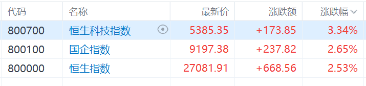 2月23日,港股三大指数集体上涨,恒指涨2.53%,国指涨2.65%,恒生科技指数涨3.34%。 | 代码 | 名称 | | 最新价 | 涨跌额 | 涨跌幅 √ | | --- | --- | --- | --- | --- | --- | | 800700 | 恒生科技指数 | (0) | 5385.35 | +173.85 | 3.34% | | 800100 | 国企指数 | | 9197.38 | +237.82 | 2.65% | | 800000 | 恒生指数 | | 27081.91 | +668.56 | 2.53% | 盘面上,权重科技股集体上涨,美团涨超5%,京东、阿里巴巴、小米、百度、快手、腾讯控股涨超3%;光通信板块领涨,长飞光纤光缆大涨超14%;黄金 及贵金属板块走强,潼关黄金大涨超12%;锂电池板块活跃,赣锋锂业大涨超8%;汽车板块涨幅居前,蔚来、比亚迪、理想汽车等走高;机器人板块强 势,沃尔核材涨超8%;保险股、核能股、光伏太阳能股、手游股、博彩股、智能驾驶概念股等纷纷上涨。 另一方面,农产品、纸业股、乳制品、旅游及观光、影视股、家具股等少数板块表现低迷。 | 代码 | 名称 | ...